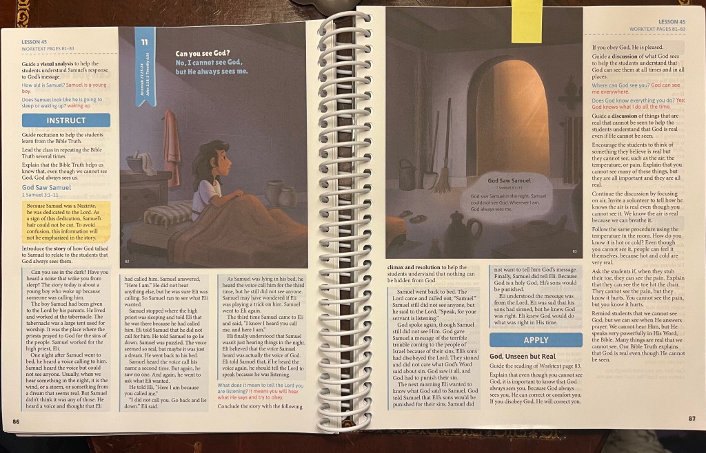 I gave it a try with BJU Bible Truths 1. I love and truthfully chose this curriculum specifically for its catechism approach. Here we are learning the Bible Truth – “Can you see God? No, I cannot see God, but He always sees me.”